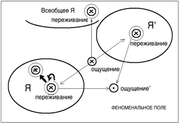 И тут есть крайне занятная вещь, отнюдь не всегда бросающаяся в глаза. Так как наше Я возникает не сразу, то оказывается, что ощущения — есть, а наше Я еще отсутствует. То есть ощущения немалое время жизни еще никому не даны, они, как ни странно, — ничьи (см. в центре рисунка). Они не переживаемы, хотя уже есть. Ведь только потом в океане ощущений, из комбинации ощущений рождается Я — как культурно организованная форма соощущения ощущений. И только тогда, как я уже говорил, ощущения превращаются в переживания (см. рисунок — ощущение в «оболочке» ощущения принадлежности Я).