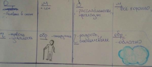 Листок ребята делят на 8 равных квадратов. 4 квадрата слева относятся к состоянию перед экзаменом (если трудно представить, можно предложить ребятам просто поменять любое негативное состояние на позитивное), 4 других — желаемое состояние во время экзамена.