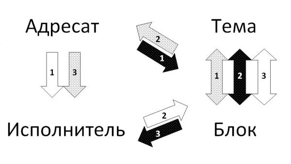 Разумеется, каждый такой блок информации включает несколько частных тем. При этом нельзя забывать о наличии и вкладе в победу нескольких участников спортивной подготовки: руководителя спортивной организации, тренера, команды, спортсмена, родителей юных спортсменов. Таким образом, при восприятии практически ориентированной информации, помимо связанных категорий «тема — блок», целесообразно использовать ещё два понятия: «адресат информации» и «исполнитель практических рекомендаций» [4, 5]. Получается, что любая практическая рекомендация, методика, технология, закономерность, статистическая информация может характеризоваться этими четырьмя существенными и дополняющими друг друга признаками (рис. 2): тема-блок, адресат информации, конечный исполнитель. Сбор и анализ информации, а также подготовку практических рекомендаций по психолого-педагогическому обеспечению спортивной подготовки очень удобно проводить с их использованием.