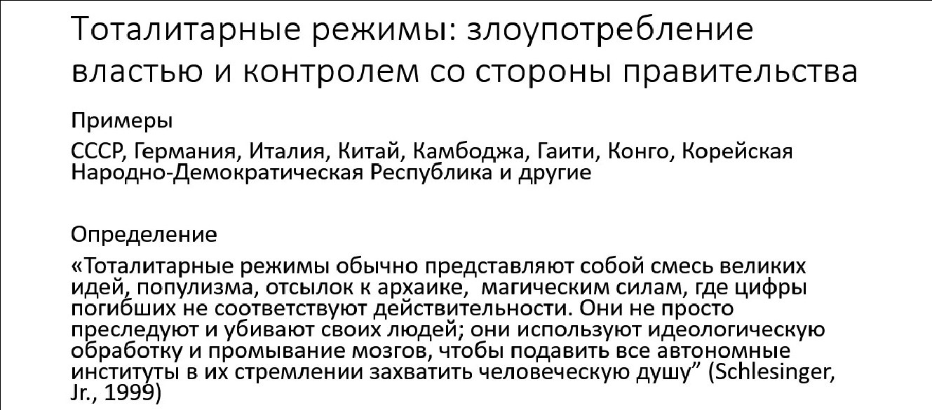 Какой режим считается тоталитарным и чем он отличается от диктаторства (рис. 8)? Лучшее определение тоталитарных режимов, которое я нашла, — это определение Шлезингера, который написал, что они представляют собой смесь великих идей, популизма, отсылок к архаике, магическим силам, где цифры погибших не соответствуют действительности. Они не просто преследуют и убивают своих людей, они используют идеологическую обработку и промывание мозгов, чтобы подавить все автономные институты в их стремлении захватить человеческую душу.
