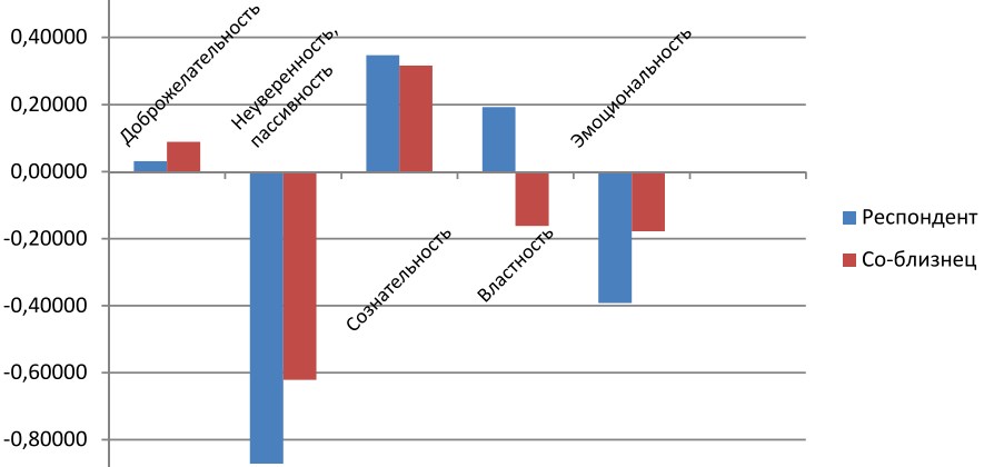 На рис. 1 представлены данные по пяти выделенным факторам для всех четырёх ответов респондентов. Оценки себя и со-близнеца схожи: оба члена пары рассматриваются как доброжелательные, ответственные, эмоциональные, довольно мягкие. Единственный фактор, по которому наблюдаются значимые различия в оценках — это неуверенность в себе. Респонденты видят себя более пассивными и неуверенными, чем своих со-близнецов (2,76 vs 1,82, p ≤ 0,01).