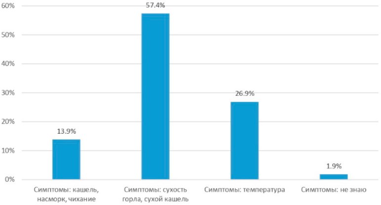 Наиболее характерными симптомами проявления данной болезни назвали сухость горла и сухой кашель (57,4%), а также повышение температуры тела до 38 градусов (26,9%). Не знали о симптомах 1,9% опрошенных (рис. 2).