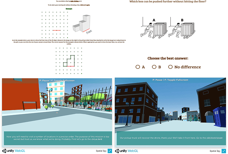 Да, наши эстонские и итальянские коллеги разработали две полномасштабных компьютерных игры, King’s Challenge и Spy, которые используются для всеохватывающей оценки пространственных способностей. (Вообще-то, игры это только по форме, а на самом деле — серьезные исследовательские инструменты.) В первой вы — известный королевский инженер, решающий серию задач для возведения замка королю: нужно нарисовать 2D-проекцию стен, ориентируясь на 3D-изображение, или наоборот; опознать угол, с которого представлен конкретный вид объекта; решить серию задач на физическую логику (какой ящик упадет первым, какая шестеренка крутится быстрее, кто из двух наблюдателей видит другого в зеркале); найти выход из лабиринта... Эти и другие задачи решаются на скорость, а финальную оценку по каждому блоку можно зашерить в соцсетях!
