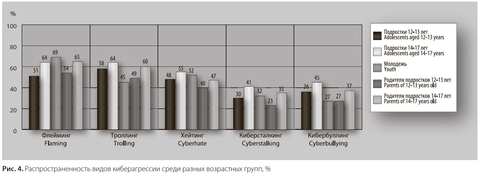 Киберагрессия становится распространенным видом деструктивного поведения в сети. Среди всех поколений именно подростки, особенно старшие, находятся в зоне риска по интенсивности столкновения с онлайн-агрессией. Большинство подростков имеют опыт столкновения с несколькими видами киберагрессии, чаще всего с флеймингом, троллингом и хейтингом, несколько реже — с кибербуллингом и киберсталкингом. Молодые люди чаще остальных сталкиваются с флеймингом, реже с хейтингом и троллингом. В течение недели с флеймингом сталкивается треть подростков, с троллингом — каждый пятый, а с хейтингом — каждый шестой. Каждый пятый подросток сталкивается с наиболее опасными видами киберагрессии — киберсталкингом и группами ненависти (формой кибербуллинга) — не реже раза в месяц. То есть, частота столкновения с различными видами онлайн-агрессии, особенно среди подрастающего поколения, достаточно высокая.