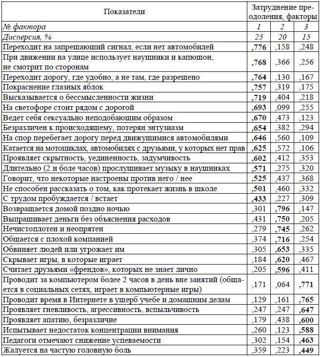 - снижение ценностного отношения к правилам, в том числе нормам безопасности на дорогах (,776); при движении на улице использует наушники и капюшон, не смотрит по сторонам (,768); переходит дорогу, где удобно, а не там, где разрешено (,764); на светофоре стоит рядом с дорогой (,693); на спор перебегает дорогу перед движущимися автомобилями (,646); катается на мотоциклах, автомобилях с друзьями, у которых нет прав (,625);