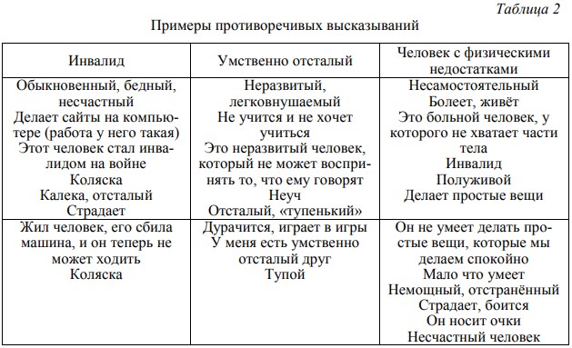 - противоречивые высказывания (табл. 2);