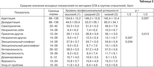 Очевидно, что помимо внешней оценки успешности, существуют также иные, внутренние детерминанты повышения эффективности деятельности и самооценки ее успешности. В качестве одной из психологических детерминант профессиональной успешности спасателей проанализируем их способность к адаптации [15]. В целом, выборку спасателей можно охарактеризовать как обладающую адаптационными возможностями, поскольку все показатели общей группы находятся в границах нормы. Наиболее адаптивной является группа с высокой профессиональной успешностью, для нее характерны самые высокие показатели адаптации и самые низкие — дезадаптации. Кроме этого, в данной группе суммарный показатель «Адаптация» и входящие в него исходные показатели «Самопринятие», «Принятие других», «Интернальность» превышают границы нормы и, напротив, значения исходных показателей, являющихся маркерами дезадаптации («Непринятие себя», «Эмоциональный дискомфорт» и «Экстернальность»), находятся ниже нормативных значений. Далее от группы к группе показатели адаптации снижаются, а дезадаптации повышаются (табл. 2).