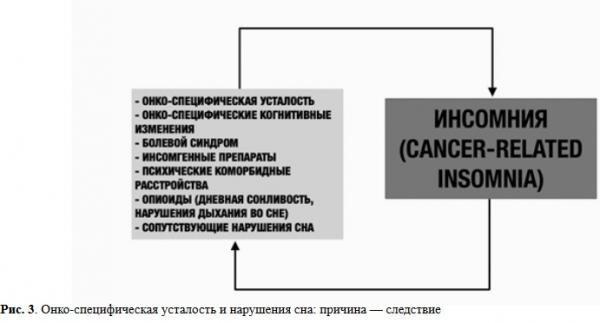Согласно психонейроиммунологической модели рака (psychoneuroimmunology model of cancer) [8], хроническая бессонница у онкологического пациента связана с повышенной онко-специфической усталостью (рис. 2), изменениями в когнитивном функционировании в форме забывчивости, изменений в концентрации внимания, что снижает способность справляться с жизненными стрессами, воспринимается как потеря контроля со стремлением находиться в режиме бдительности.