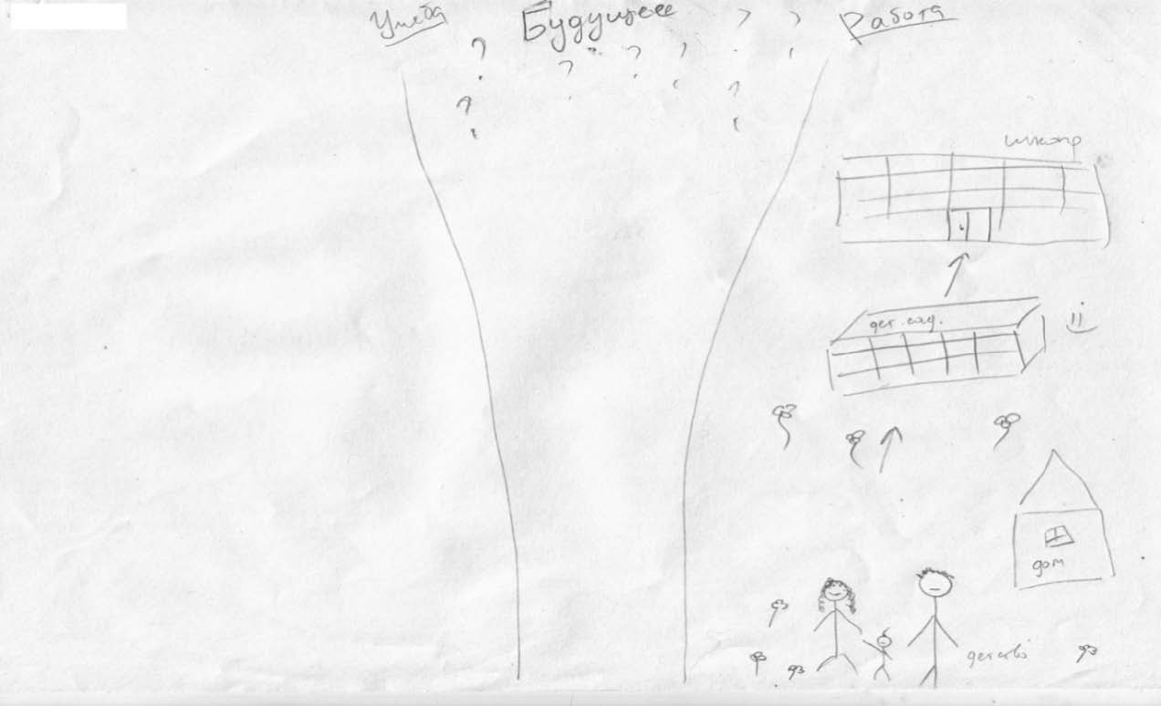 Интолерантные же рисуют схематично (как правило, рисунки занимают примерно половину листа), используют штриховку, слабо нажимают на карандаш. Также в их рисунках присутствуют вопросительные знаки (рис. 2). Можно говорить о том, что респонденты явно различаются по эмоциональному и содержательному отношению к своему будущему.