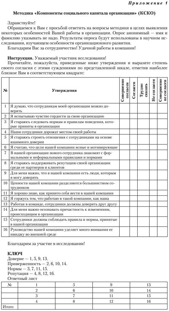 где ∑d+p+n+r — сумма реальных баллов по всей группе, полученных по показателям доверия (d), приверженности (p), соблюдения норм (n) и репутации (r); К — количество опрошенных; 80 — сумма наивысших оценок по всем вопросам методики. Уровень и структура показателей социального капитала могут свидетельствовать о существующих ресурсах или проблемах в определенных сферах социального взаимодействия в организации.