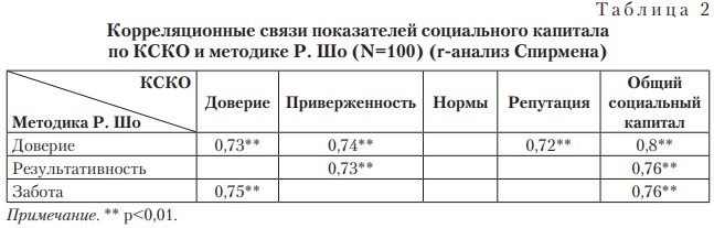 Таким образом, показатели «доверие» и «общий социальный капитал» по методике КСКО коррелируют с методикой Р. Шо, что свидетельствует о надежности нашей методики КСКО.