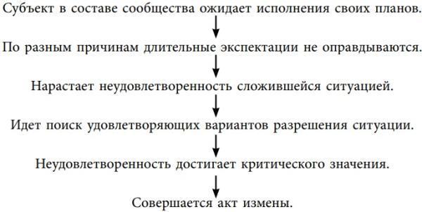 В динамике функция измены представляет собой цепочку действий, типичную как для субъектов больших сообществ, так и для малых групп, например, семьи.