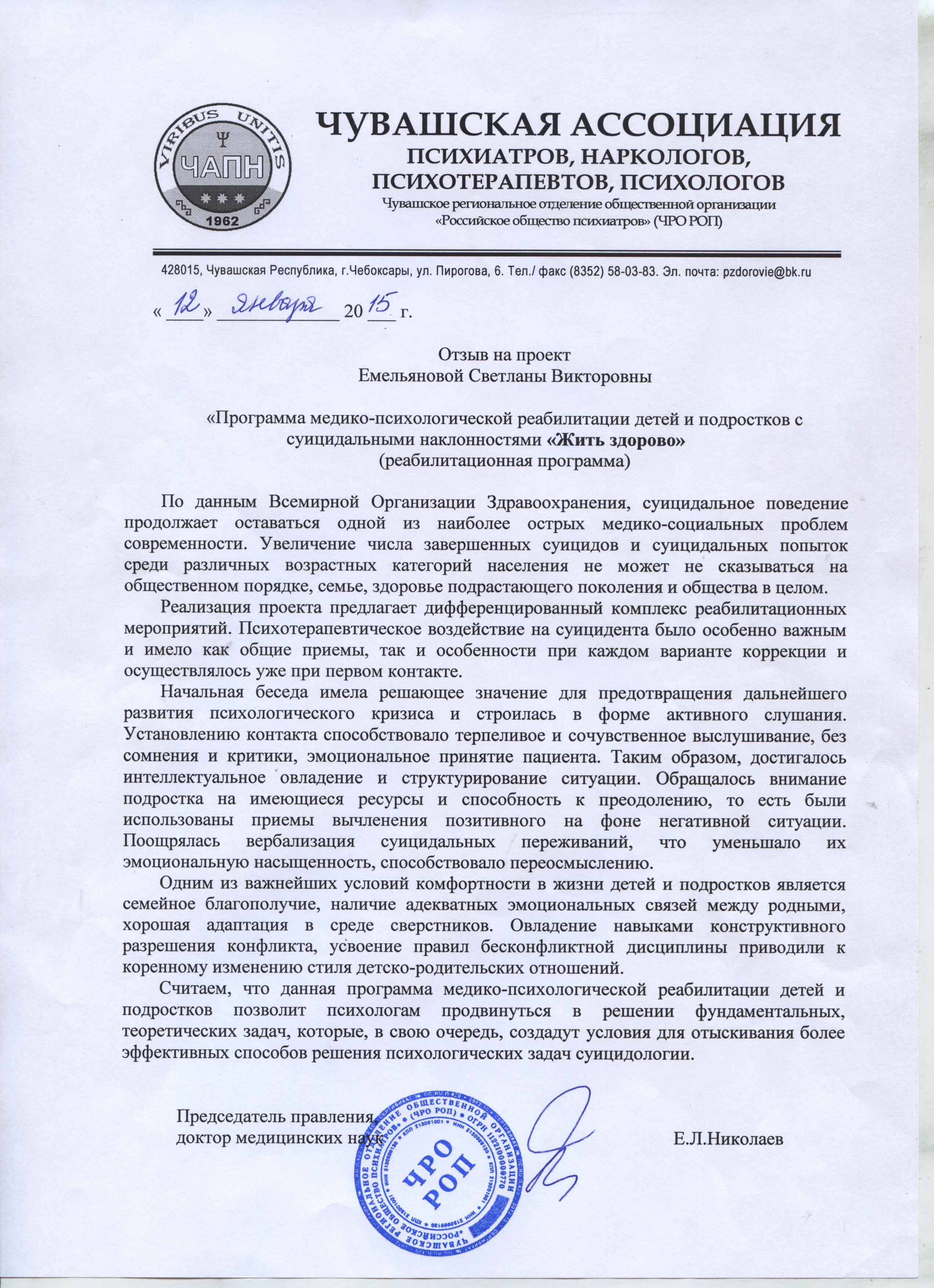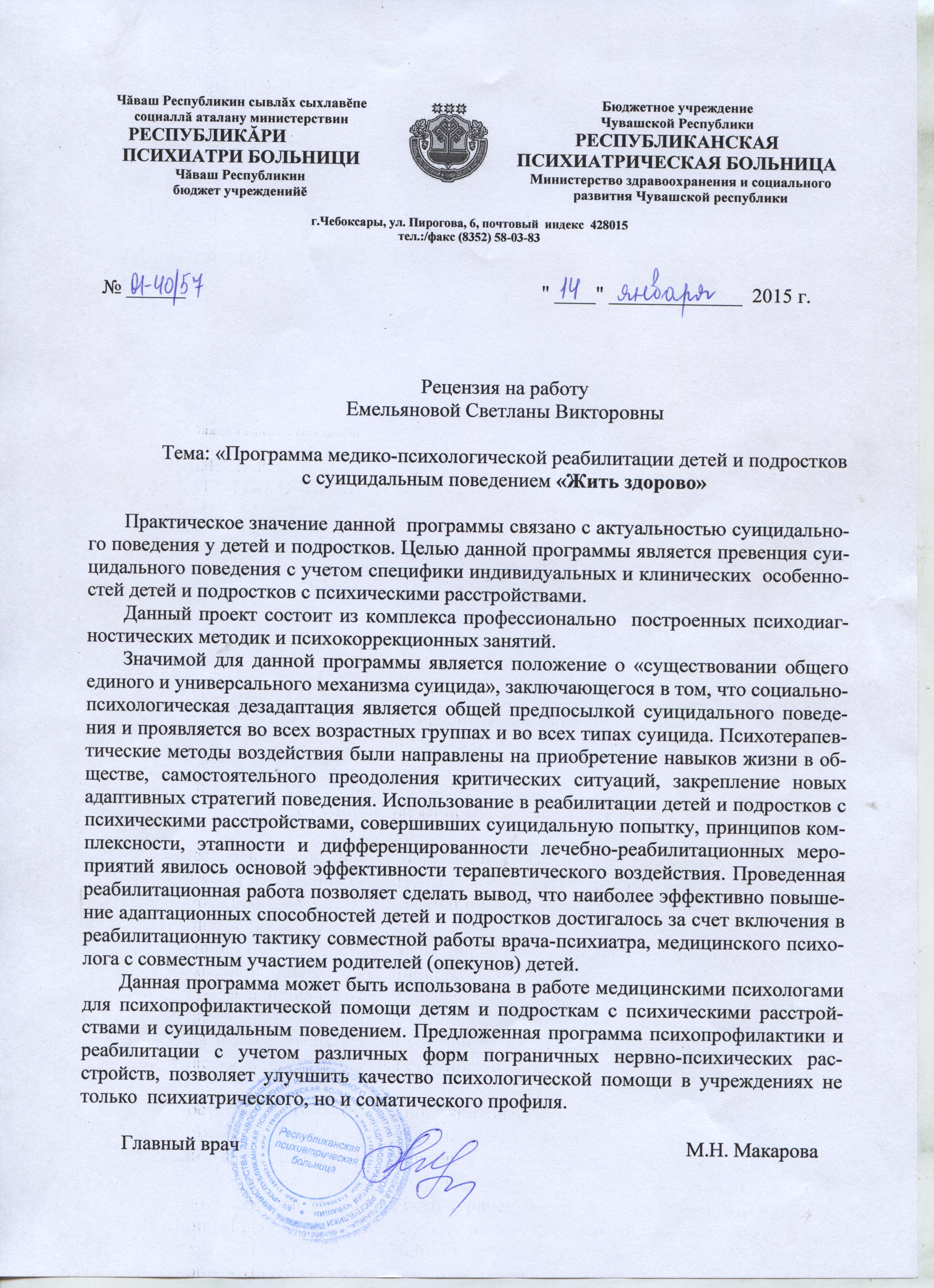 Данная программа — возможность провести психокоррекционную работу, позволяющую своевременно оказать помощь детям – обрести адекватную самооценку, увеличить способность к конструктивному решению сложных вопросов и предотвратить суицидальное поведение. Программа реализуется как в стационарном, так и в амбулаторном звене, что позволяет реализовать программу в полном объеме вне зависимости от сроков госпитализации, этапов лечения.
