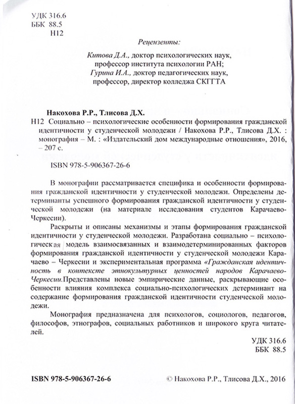 В монографии рассматривается специфика и особенности формирования гражданской идентичности у студенческой молодежи. Определены детерминанты успешного формирования гражданской идентичности у студенческой молодежи (на материале исследования студентов Карачаево-Черкесии). Раскрыты и описаны механизмы и этапы формирования гражданской идентичности у студенческой молодежи. Разработана социально–психологическая модель взаимосвязанных и взаимодетерминированных факторов формирования гражданской идентичности у студенческой молодежи. Разработана и внедрена в образовательный процесс экспериментальная программа «Гражданская идентичность в контексте этнокультурных ценностей народов Карачаево-Черкесии». Представлены новые эмпирические данные, раскрывающие особенности влияния комплекса социально-психологических детерминант на формирования гражданской идентичности у студенческой молодежи.