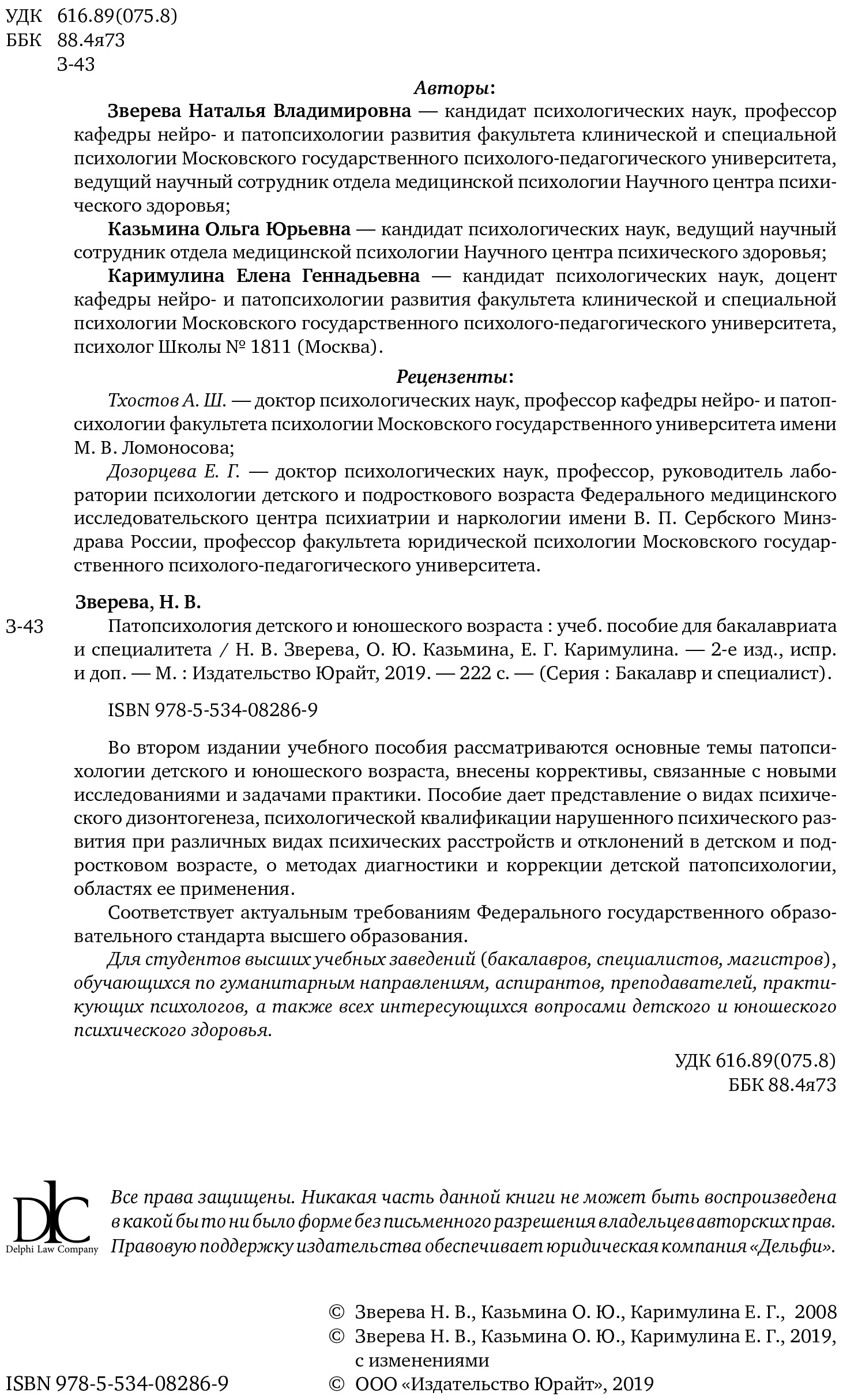 Патопсихология детского и юношеского возраста - это учебное пособие для бакалавриата и специалитета, рекомендованное Учебно-методическим отделом высшего образования для студентов высших учебных заведений, обучающихся по гуманитарным направления. Книга также рекомендована Советом по психологии Учебно-методического объединения по классическому университетскому образованию для студентов, получающих высшее образование по направлению «Психология» и психологическим специальностям.