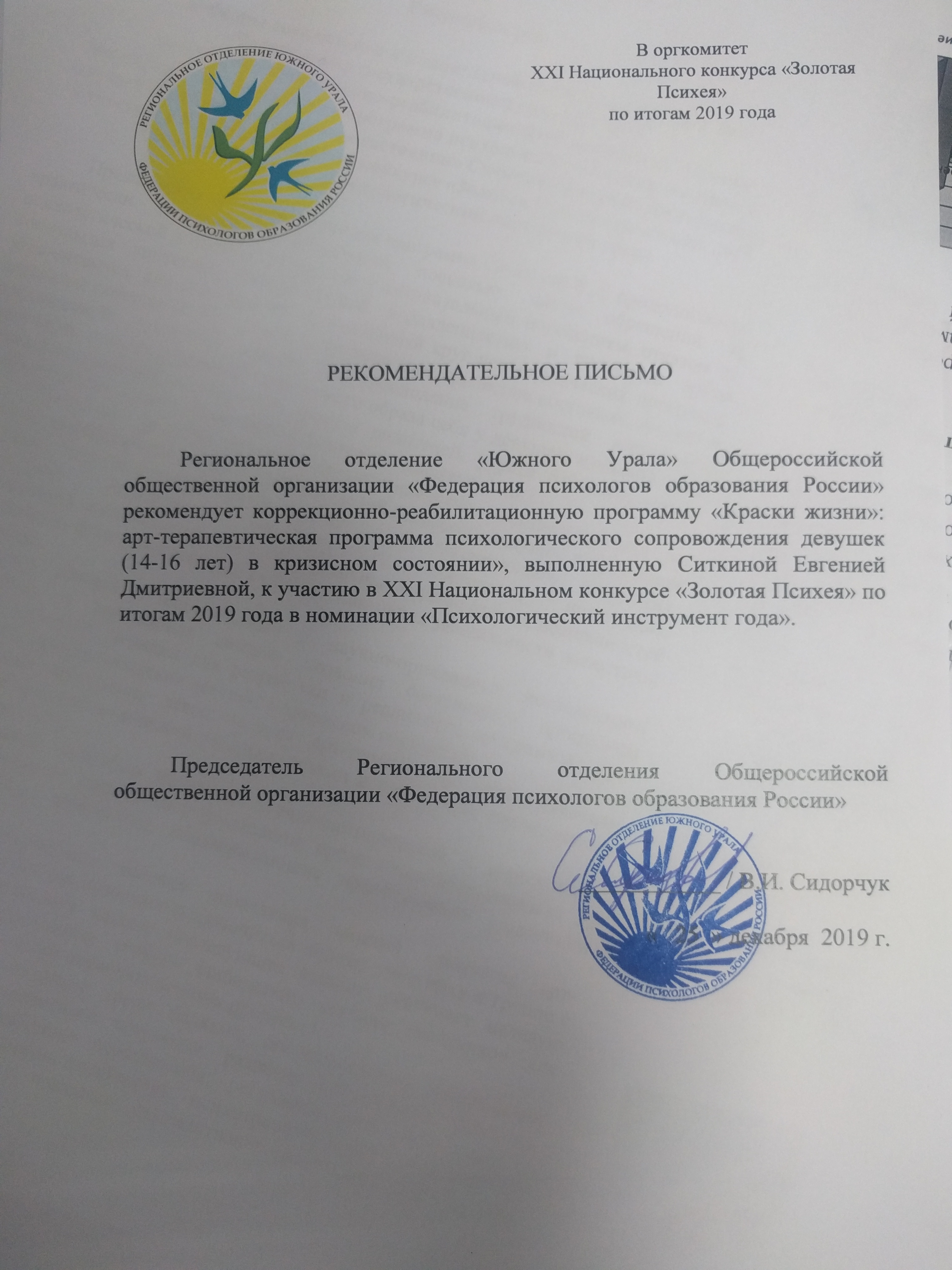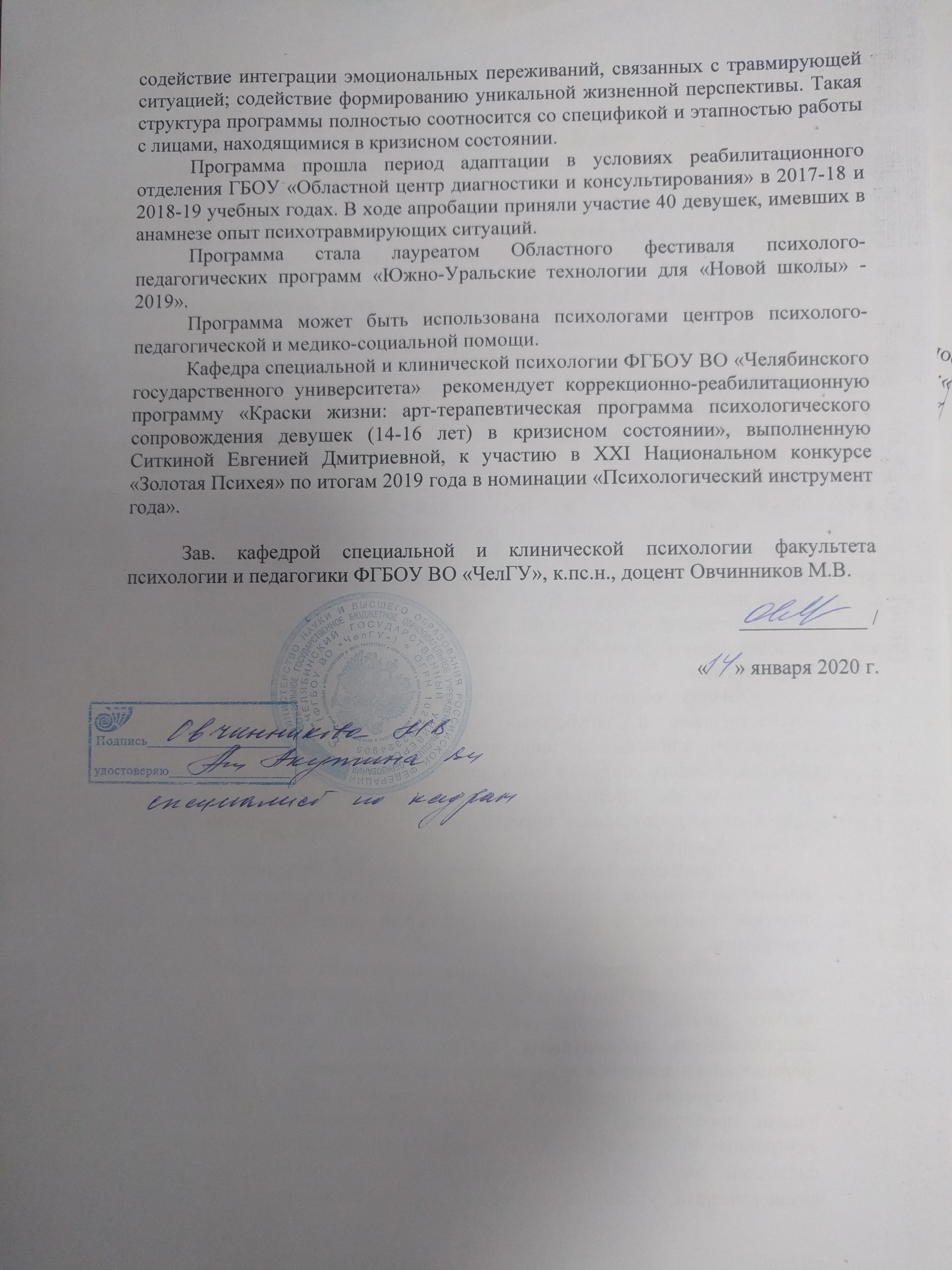 Апробация программы проведена с 15 сентября 2017 г. по 31 мая 2019 г. на базе в реабилитационного отделения ГБОУ «Областной центр диагностики и консультирования» г. Челябинска. В апробации приняли участие 40 девушек.