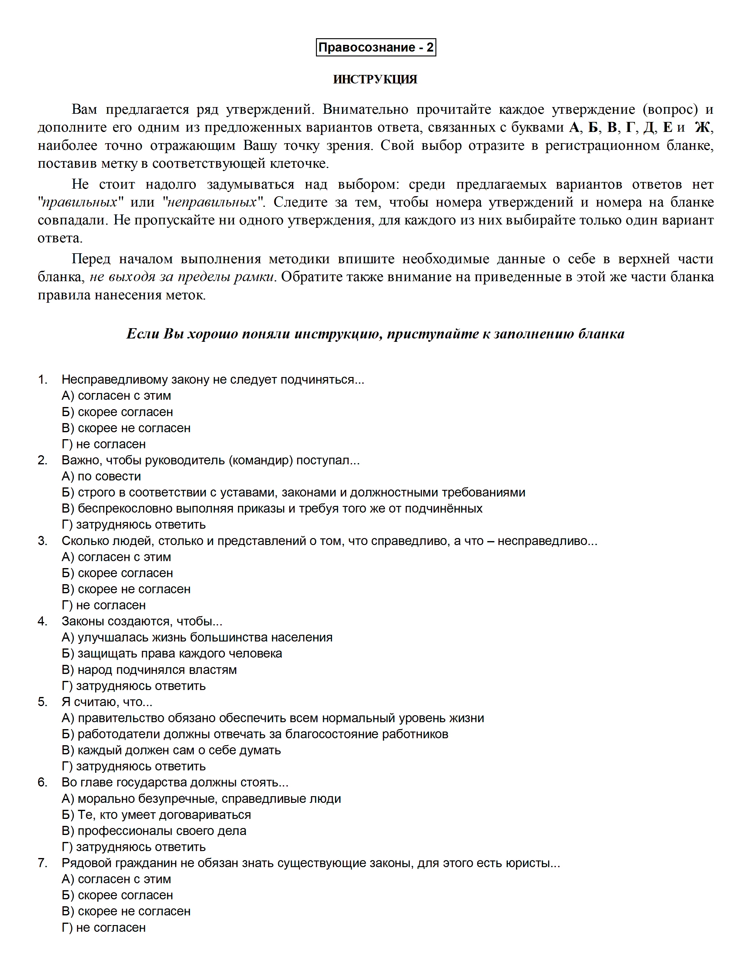 Применяющаяся в настоящее время в профессионально-психологическом отборе на службу в ОВД методика Л.А. Ясюковой для изучения правосознания изначально предназначалась для обследования учащихся старших классов общеобразовательных школ. Имеются данные, подтверждающие связь показателей методики с успешностью прохождения профессионально-психологического отбора на службу в ОВД, а также с профессиональной успешностью некоторых категорий госслужащих в правоохранительных органах. Тем не менее, данная методика, включающая 13 вопросов, является недостаточно информативной для изучения правосознания сотрудников подобного профиля деятельности. Кроме того, её измерительная мощность недостаточна для получения дискриминативных результатов обследования.