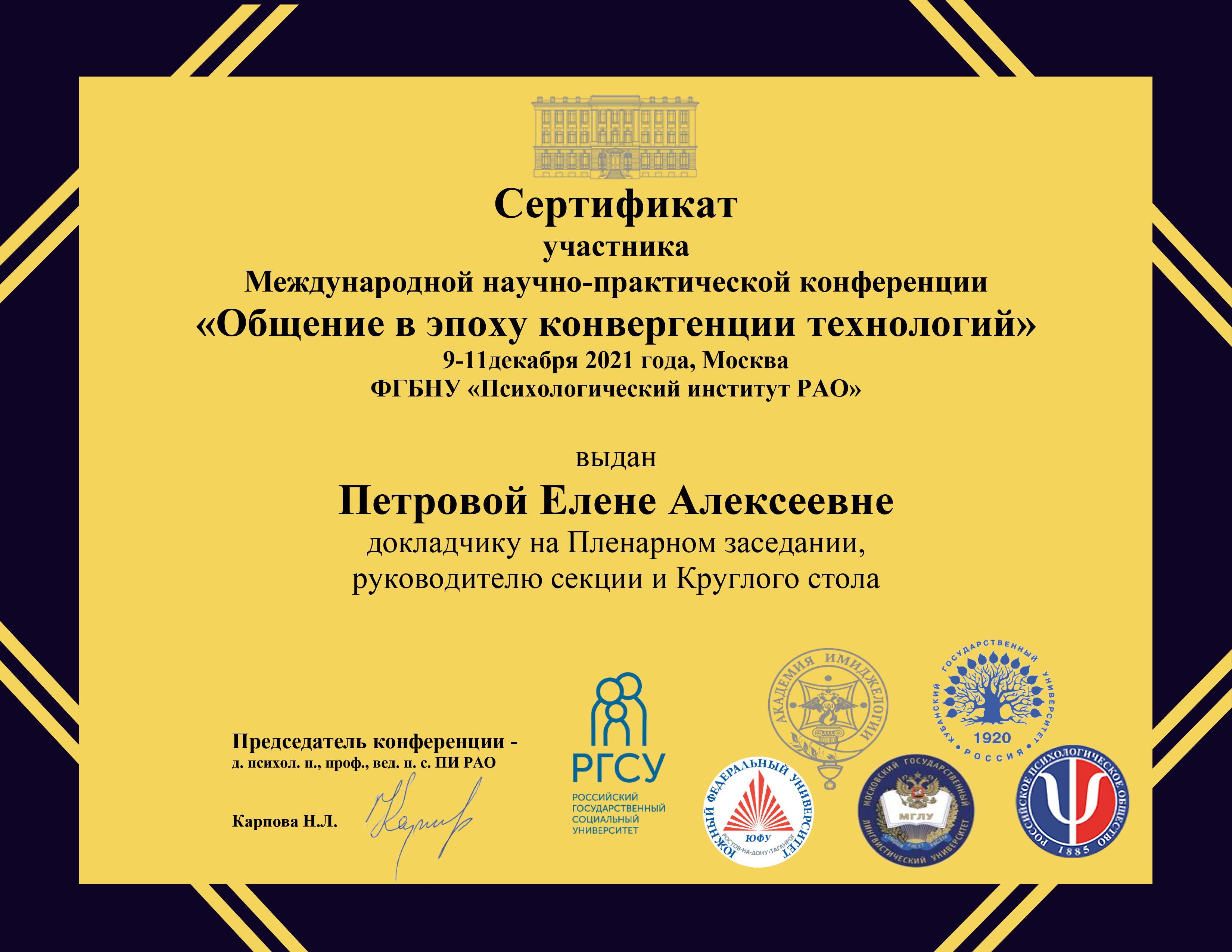9-11 декабря 2021 года на платформах ФГБНУ «Психологического института РАО» (ПИ РАО) и ФГБОУ ВО «Российский государственный социальный университет» (РГСУ) состоялась Международная научно-практическая конференция «Общение в эпоху конвергенции технологий».
