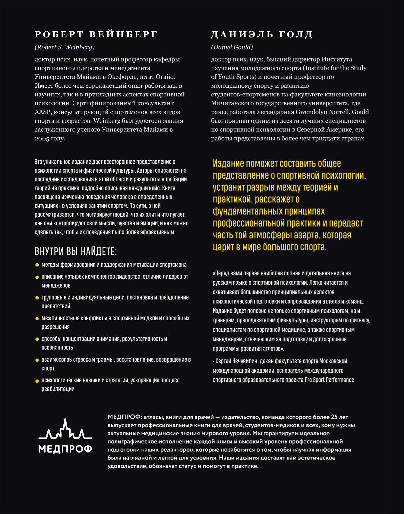 Роберт Вейнберг (Robert S. Weinberg), доктор псих. наук, почетный профессор кафедры спортивного лидерства и менеджмента Университета Майами в Оксфорде, штат Огайо. Имеет более чем сорокалетний опыт работы как в научных, так и в прикладных аспектах спортивной психологии. Сертифицированный консультант AASP, консультирующий спортсменов всех видов спорта и возрастов. Weinberg был удостоен звания заслуженного ученого Университета Майами в 2005 году.