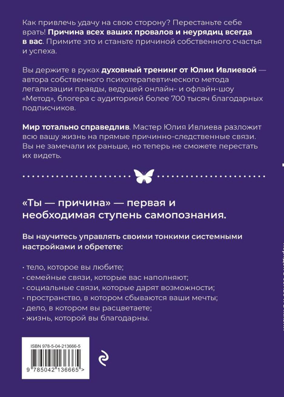 Книга Юлии Ивлиевой (Широких) «Ты — причина. Почему мы всегда получаем то, чего заслуживаем, и как навести порядок в семье и в жизни» представляет собой значимый вклад в область самопознания и личностного роста.