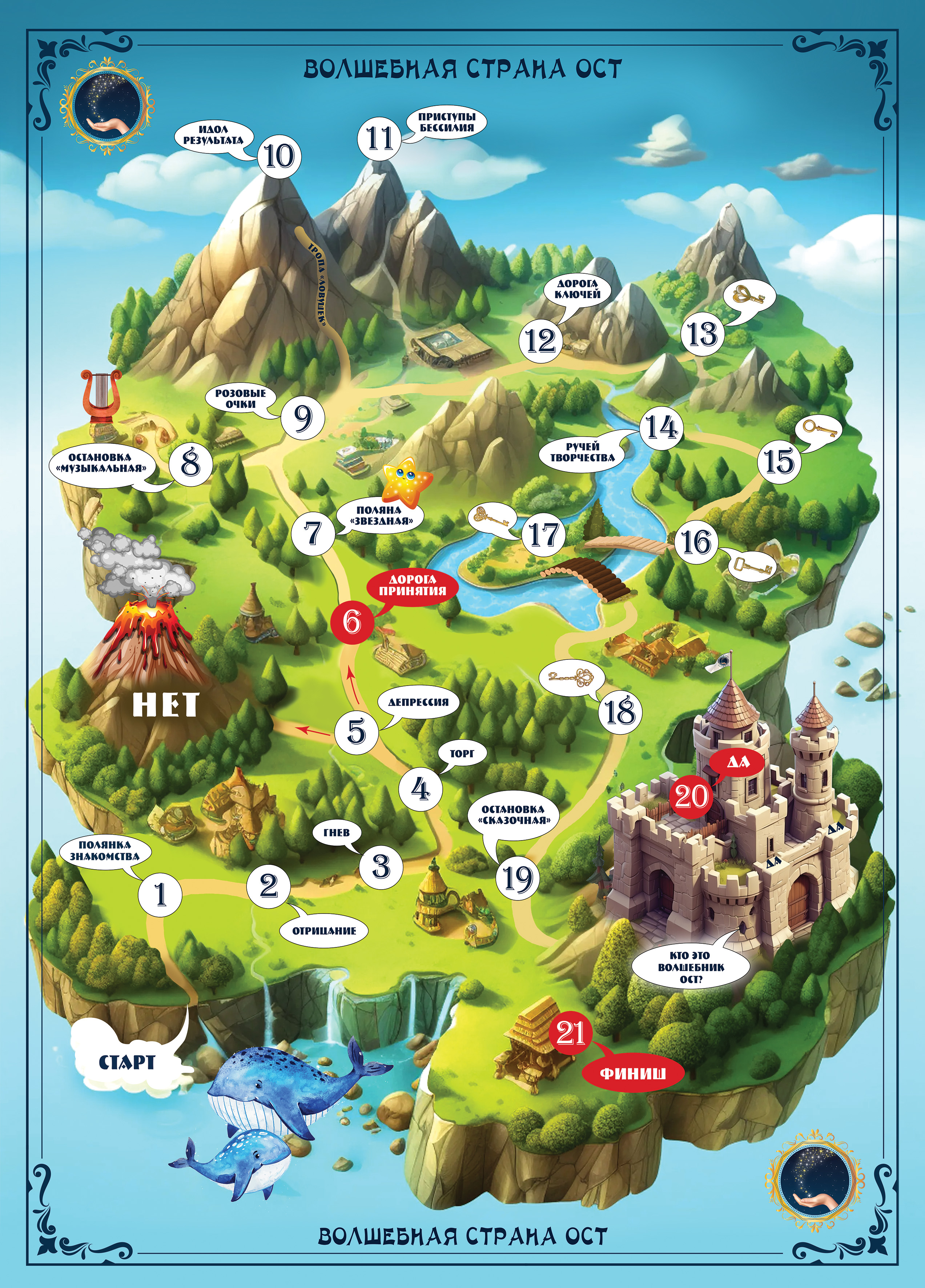 Методическое пособие «Волшебники страны ОСТ, или Особая сказкотерапия» — это трансформационная игра, включающая в себя одноименную книгу, два набора метафорических карт, игровое поле и методическую брошюру.