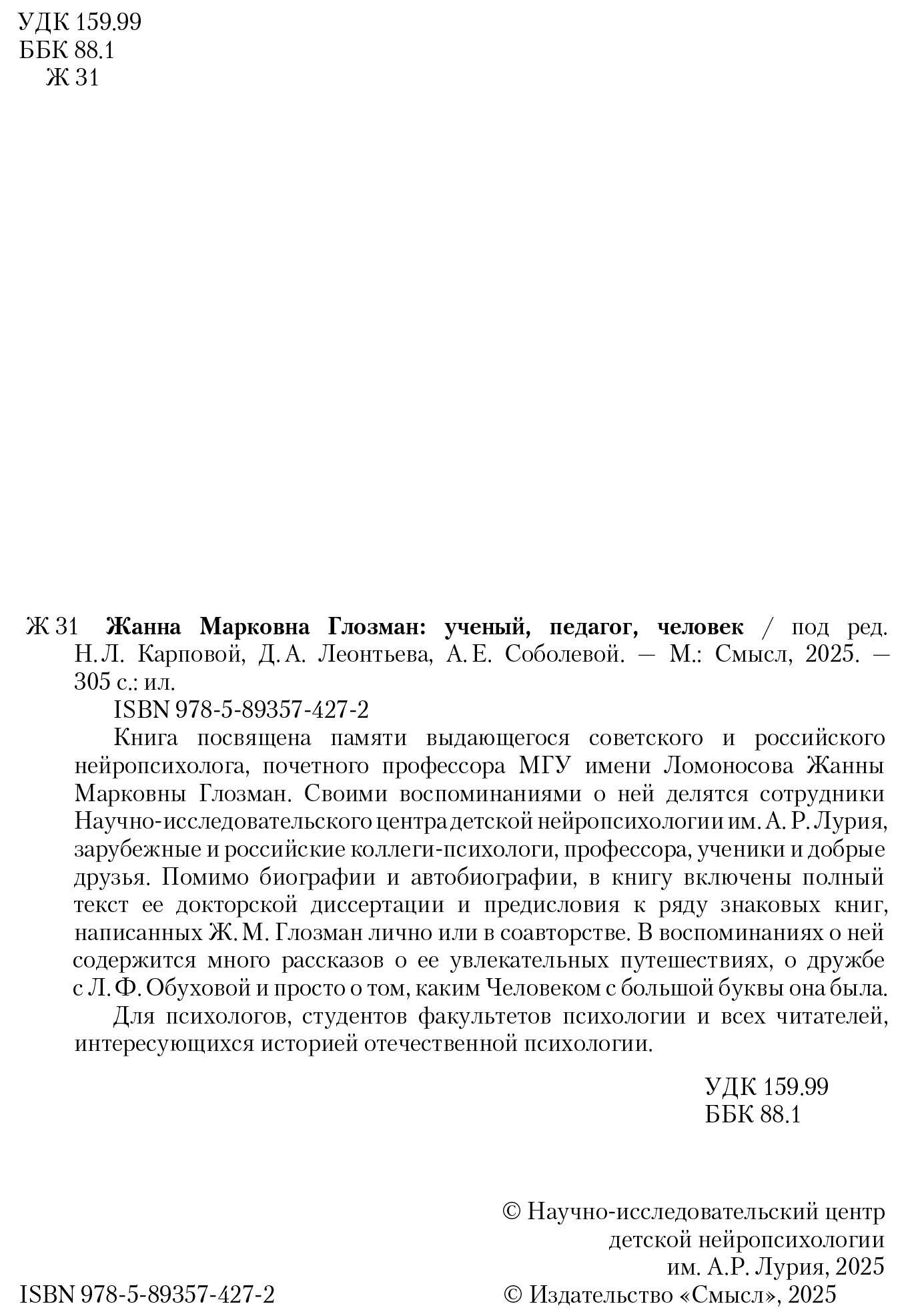 Предлагаемая коллективная монография посвящена памяти выдающегося советского и российского нейропсихолога, профессора Московского государственного университета имени М.В. Ломоносова Жанны Марковны Глозман (1940-2022) – человека, прожившего яркую, плодотворную научную жизнь теоретика и психолога-практика. 28 декабря 2025 года ей исполняется 85 лет.