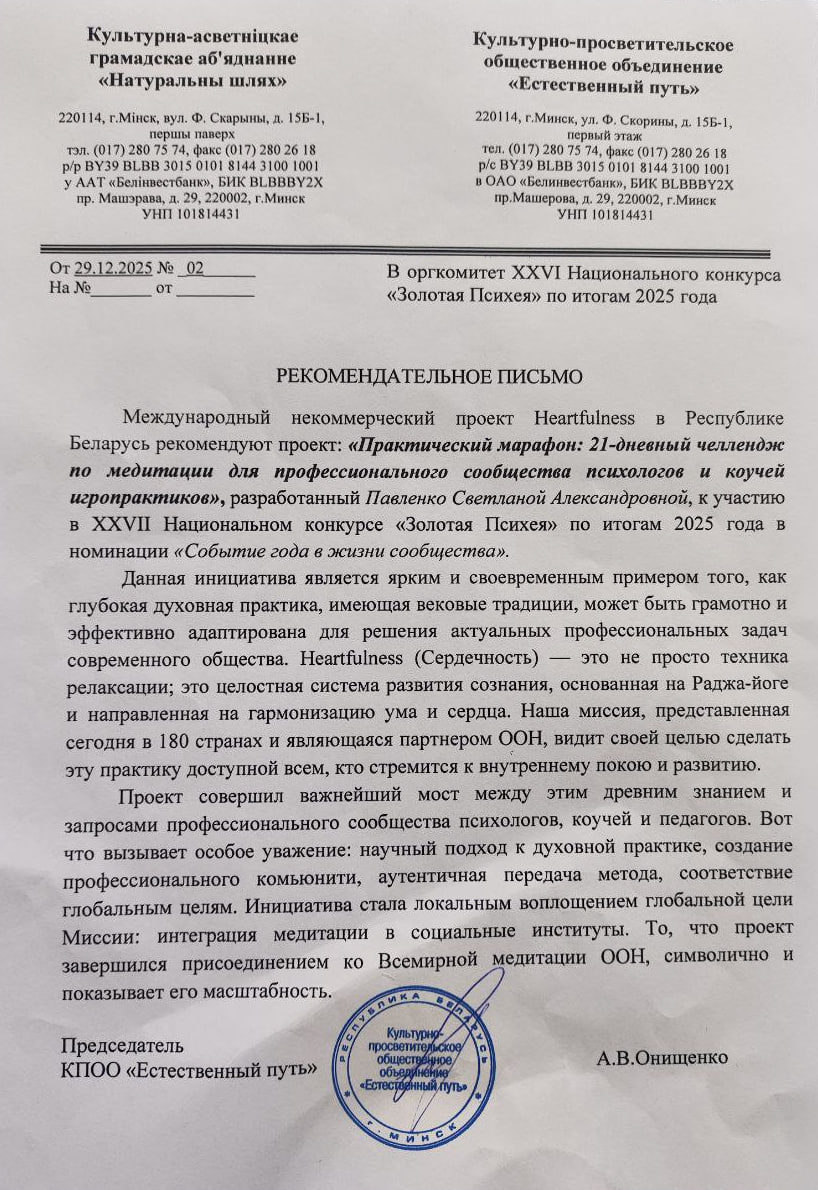 - Образовательно-практический: 21-дневный массовый онлайн-челлендж по медитации (5 вебинаров с трансляцией на 400-1000 просмотров, 21 день ежедневной практики в группе из 80 участников, участие во Всемирной медитации ООН 21 декабря 2025г).
