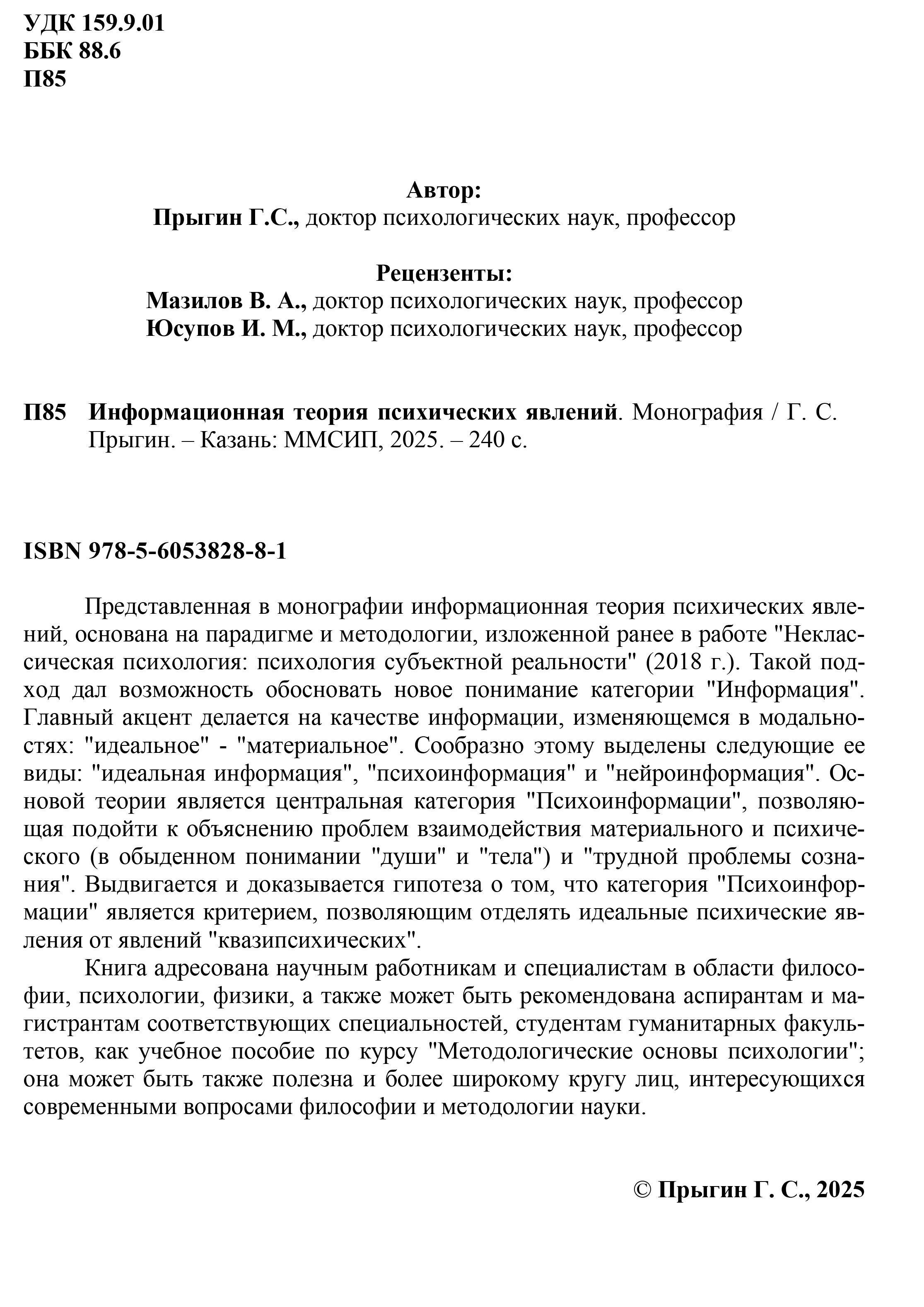 «Информационная теория психических явлений» (2025) – представление завершенной неклассической парадигмы, воплощенной в полноценной теории.