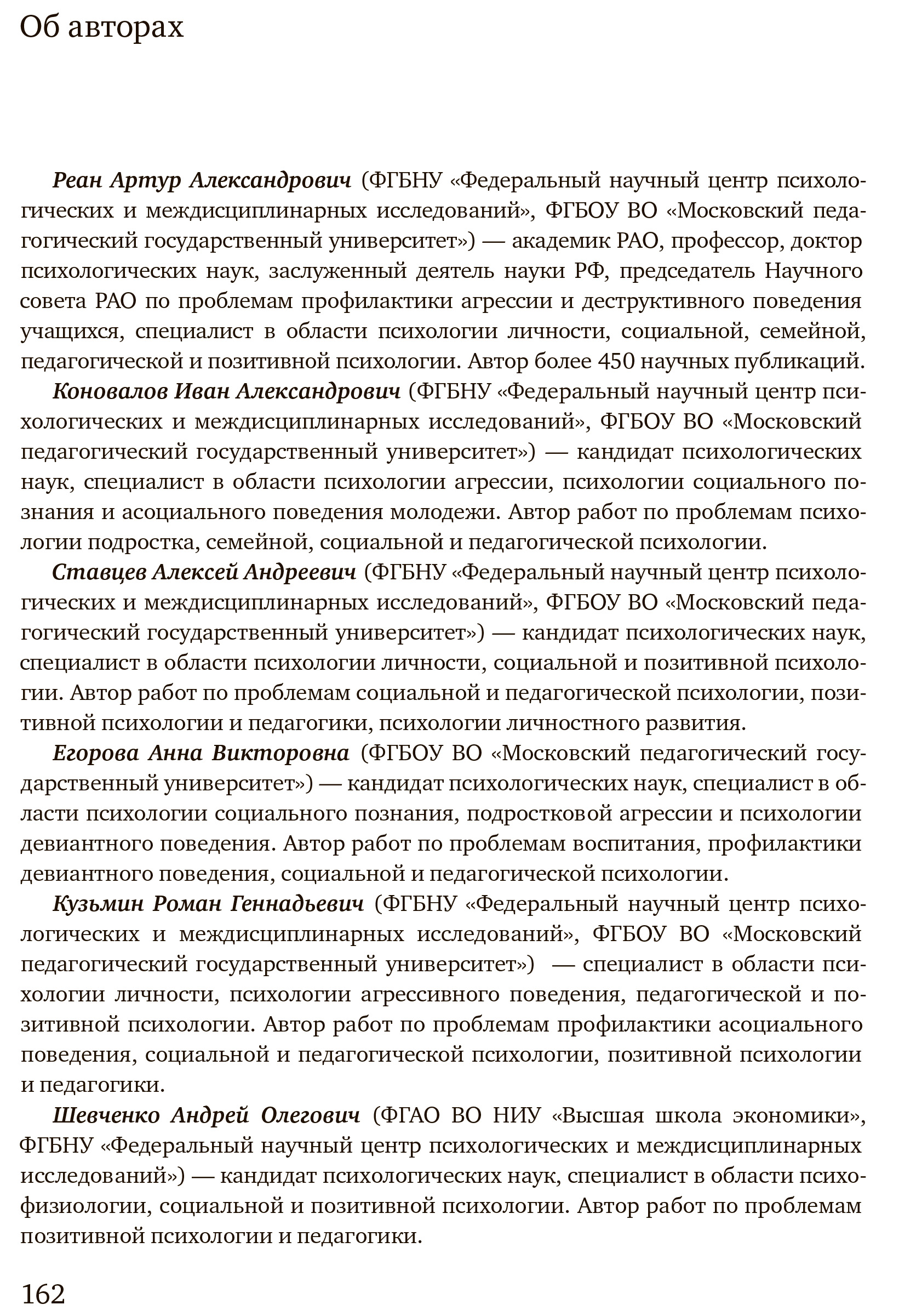 В монографии представлен анализ основных эмпирических результатов научного коллектива академика РАО А.А. Реана по проблеме соотношения социализации и агрессии. На обширном эмпирическом материале конкретизируется положение о том, что вовлеченность в агрессию является фактором риска проблем социализации. Риски проанализированы в контексте различных сред социализации (семьи, школы, неформальных групп, онлайн-пространства). Обобщены исследования социально-перцептивных образов подростковой агрессии у учителей в контексте ряда личностных особенностей. Рассмотрены актуальные тенденции социализации молодежи, связанные с представлениями о семье и браке, ценностями, показателями агрессии и благополучия.