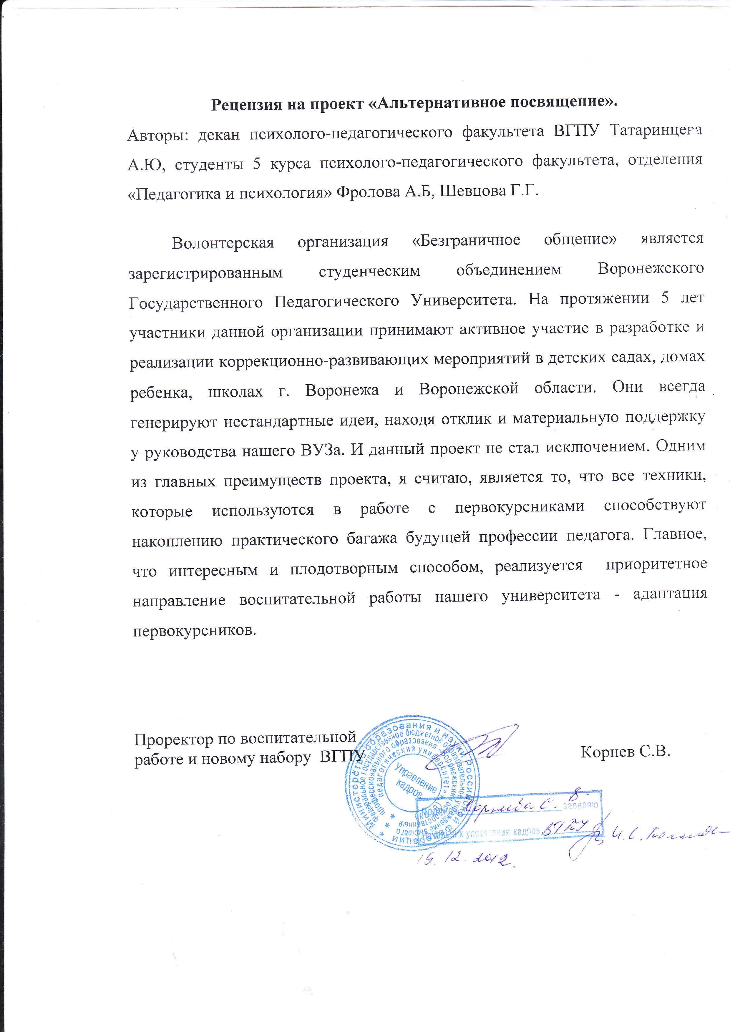 Конечно, в каждом ВУЗе проводится активная работа по адаптации первокурсников, но в большинстве своем это ограничивается беседами с куратором, выступлением в осенних концертах, сборах (в которых участвуют не все) и, естественно, посвящением в студенты. Мы предлагаем программу «Альтернативное посвящение», мы не говорим, что вышеперечисленные мероприятия не приносят результатов в адаптации, но наша программа преследует несколько другие цели и, возможно, даже более эффективна, так как включает в себя не только развлекательный, но и образовательный компонент.