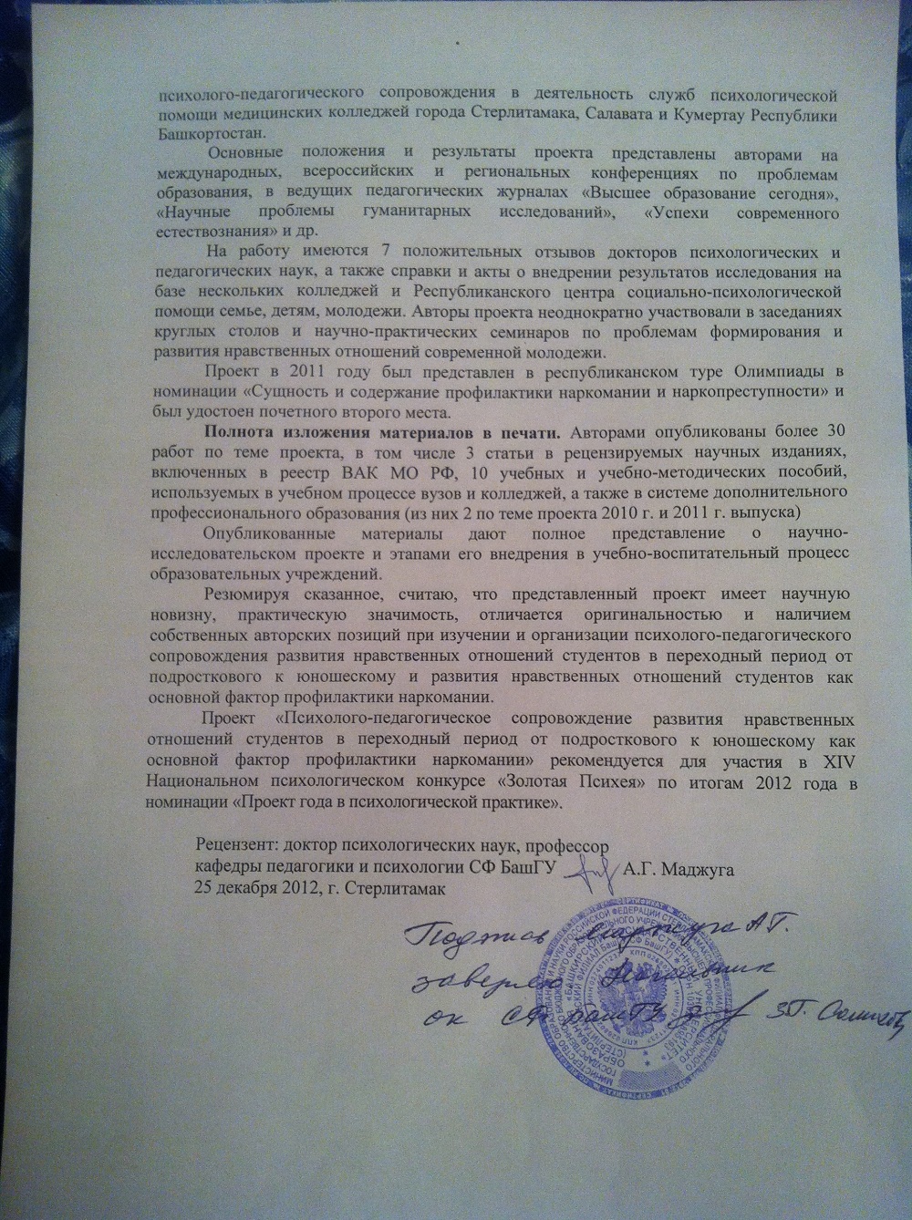 Научная значимость проекта. Создана теоретическая модель, разработана и внедрена программа психолого-педагогического сопровождения развития нравственных отношений личности студентов как основной фактор профилактики наркомании.