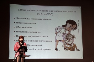 Проблему этичного и неэтичного, допустимого и недопустимого в каждодневной работе психологов затронула в докладе «Этические проблемы в психологических исследованиях и практике» Алла Вадимовна Шаболтас, канд. психол. наук, доцент, декан факультета психологии СПбГУ.